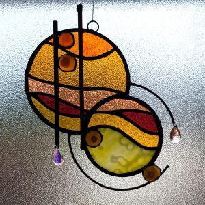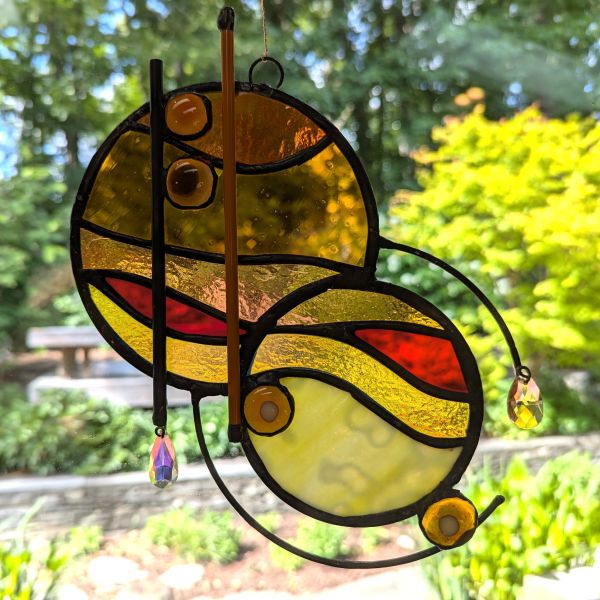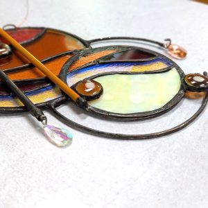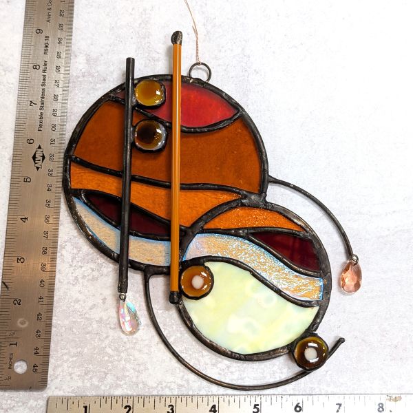 This stained glass panel was made with a variety of materials and techniques. It is approximately 7.5″ wide and 9″ long, much larger than your usual suncatcher. I used a variety of stained glass, fused glass, rods and crystals. Very unique style and detailing, this would be a great gift for anyone with contemporary and abstract tastes. Superbly well crafted, it will be a cherished gift for yourself or a loved one. Please do not use a suction cup – this piece needs to hang from something strong (I have included a hanging wire).