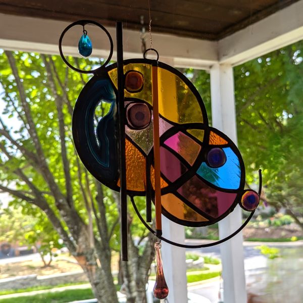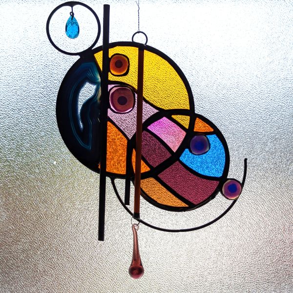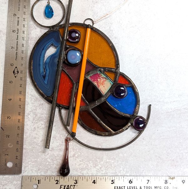 This stained glass panel was made with a variety of materials and techniques. It is approximately 7″ wide and 10″ long, much larger than your usual suncatcher. I used a variety of stained glass, fused glass, a geode slice, rods and crystals. Very unique style and detailing, this would be a great gift for anyone with contemporary and abstract tastes. Superbly well crafted, it will be a cherished gift for yourself or a loved one. Please do not use a suction cup – this piece needs to hang from something strong (I have included a hanging wire).
