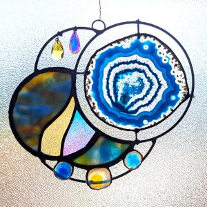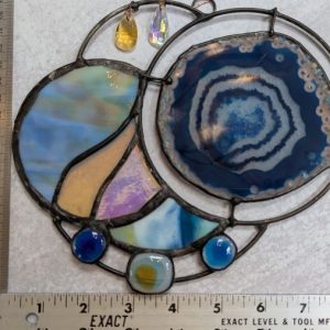 This stained glass panel was made with a variety of materials and techniques. It is approximately 8″ wide and 7″ long, much larger than your usual suncatcher. I used a variety of stained glass, fused glass, a large geode slice, rods and crystals. Very unique style and detailing, this would be a great gift for anyone with contemporary and abstract tastes. Superbly well crafted, it will be a cherished gift for yourself or a loved one. Please do not use a suction cup – this piece needs to hang from something strong (I have included a hanging wire).