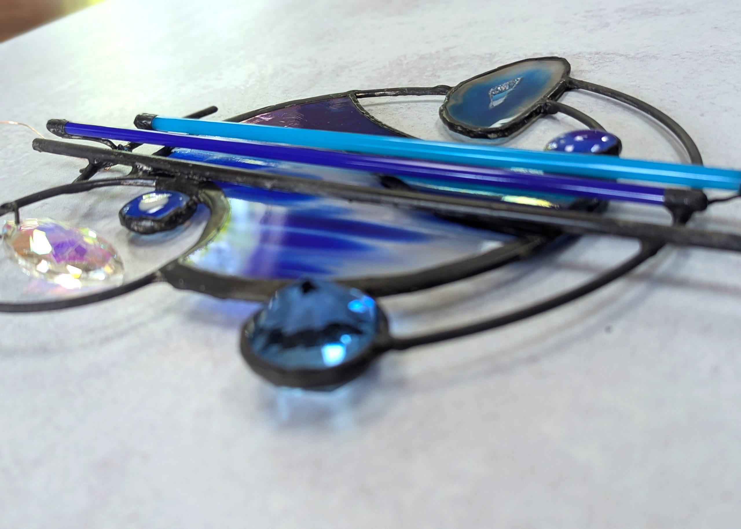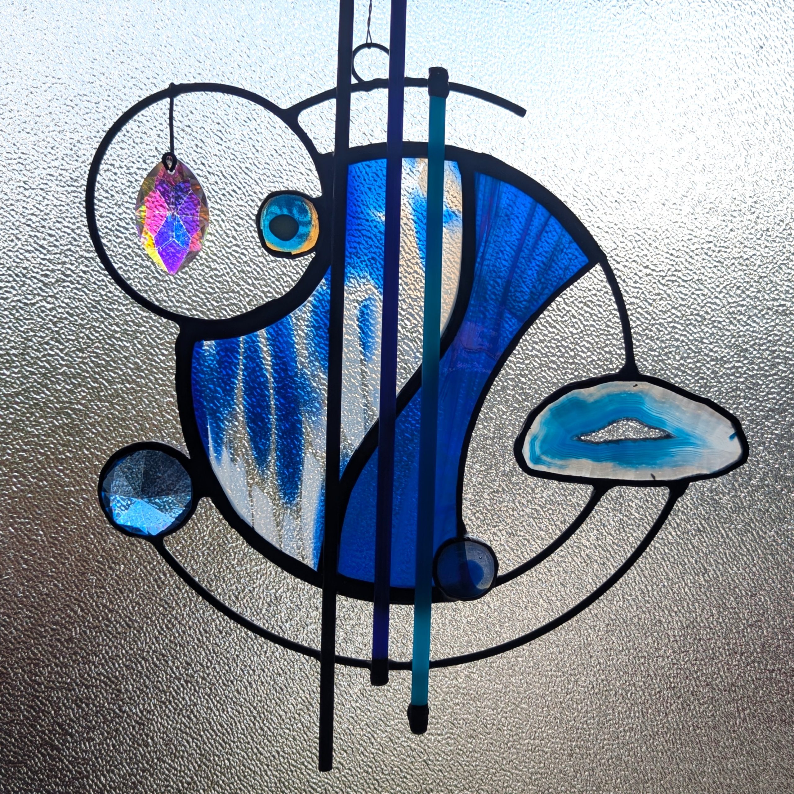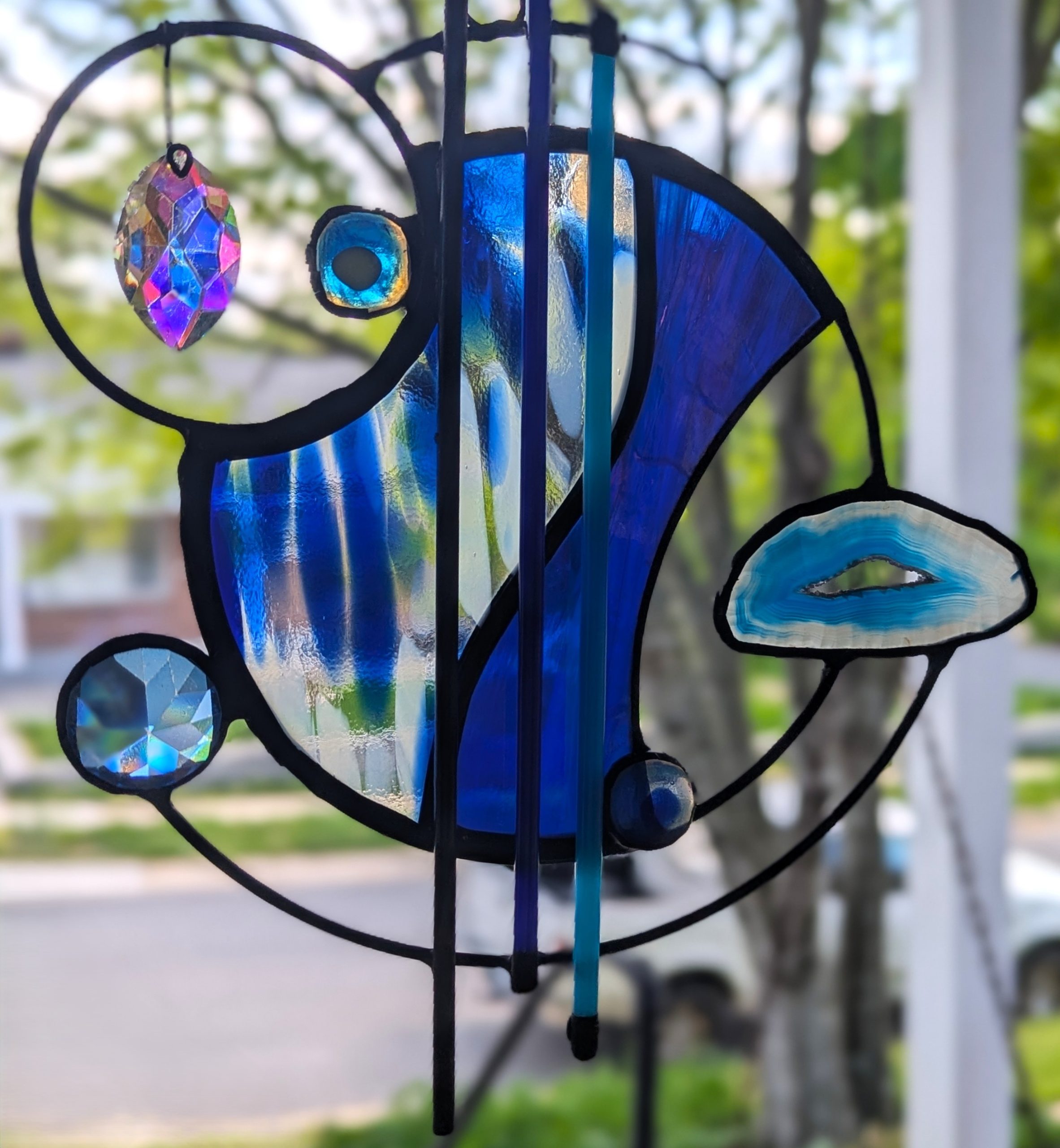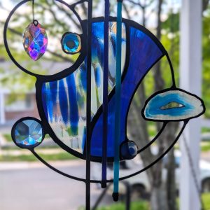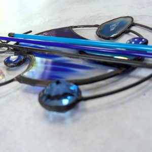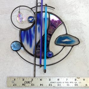 This stained glass panel was made with a variety of materials and techniques. It is approximately 8″ wide and 9″ long, much larger than your usual suncatcher. I used a variety of stained glass, fused glass, a geode slice, rods and crystals. Very unique style and detailing, this would be a great gift for anyone with contemporary and abstract tastes. Superbly well crafted, it will be a cherished gift for yourself or a loved one. Please do not use a suction cup – this piece needs to hang from something strong (I have included a hanging wire).