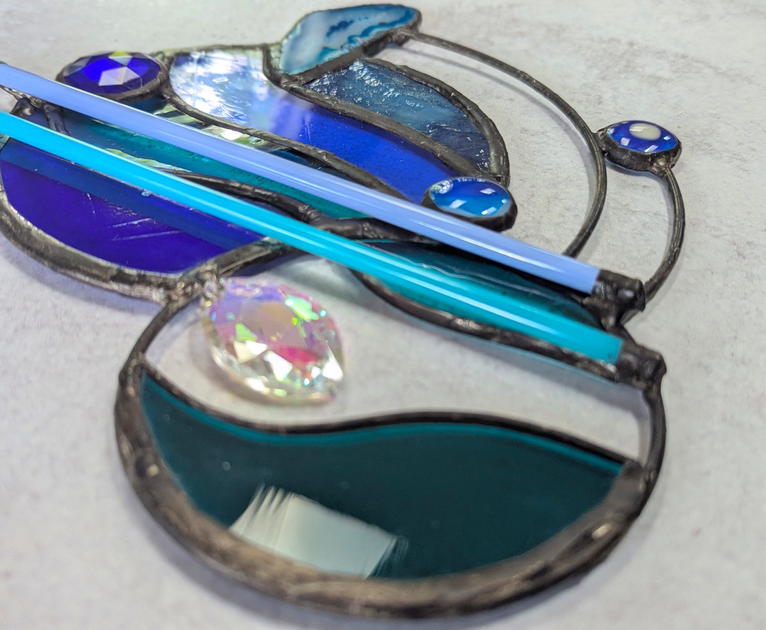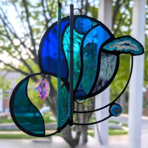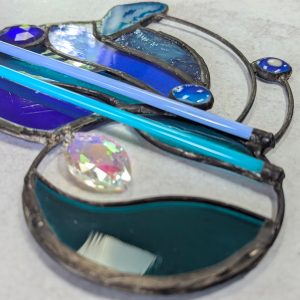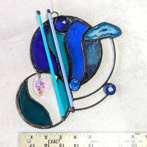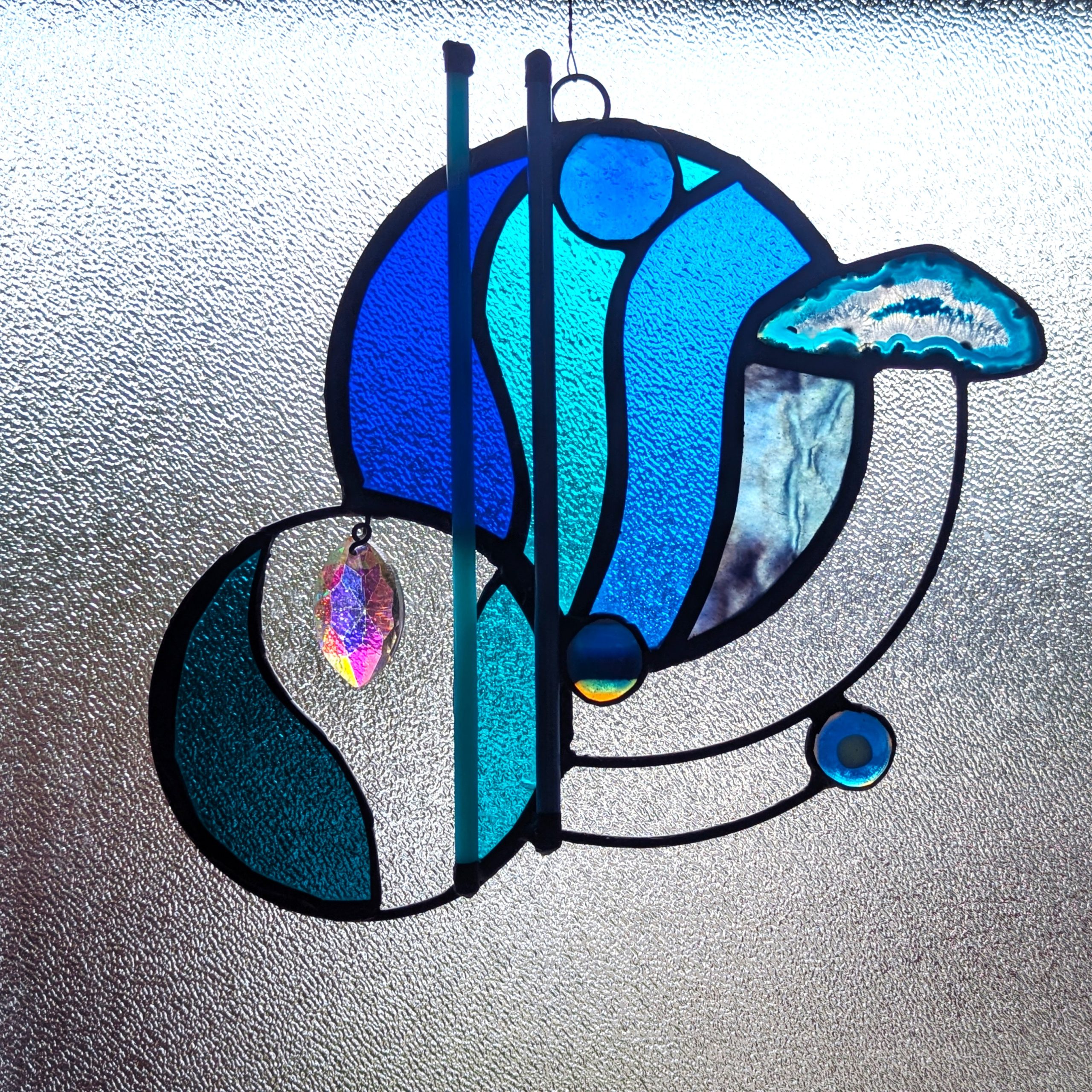 This stained glass panel was made with a variety of materials and techniques. It is approximately 8″ wide and 7″ long, much larger than your usual suncatcher. I used a variety of stained glass, fused glass, a geode slice, rods and crystals. Very unique style and detailing, this would be a great gift for anyone with contemporary and abstract tastes. Superbly well crafted, it will be a cherished gift for yourself or a loved one. Please do not use a suction cup – this piece needs to hang from something strong (I have included a hanging wire).