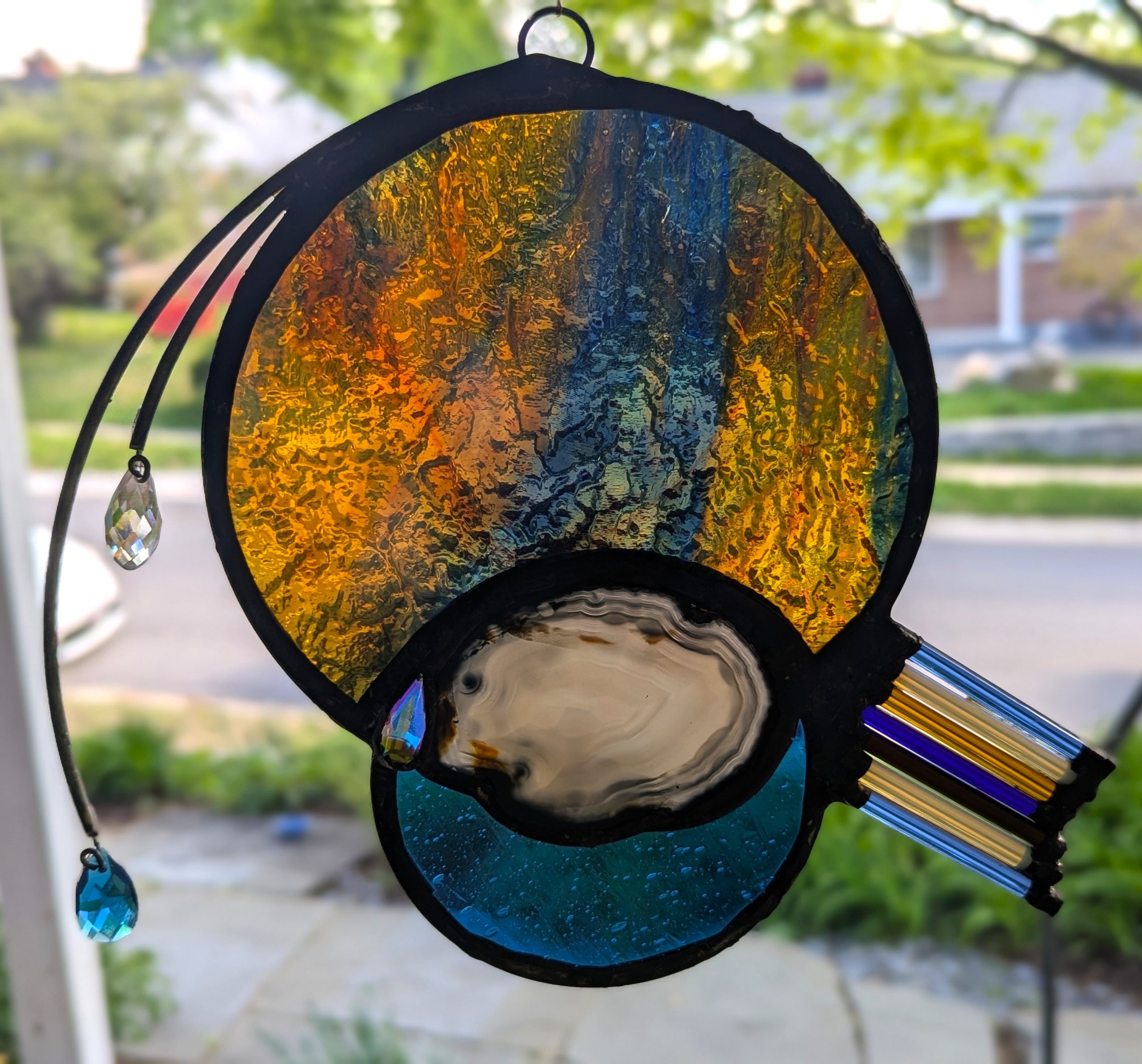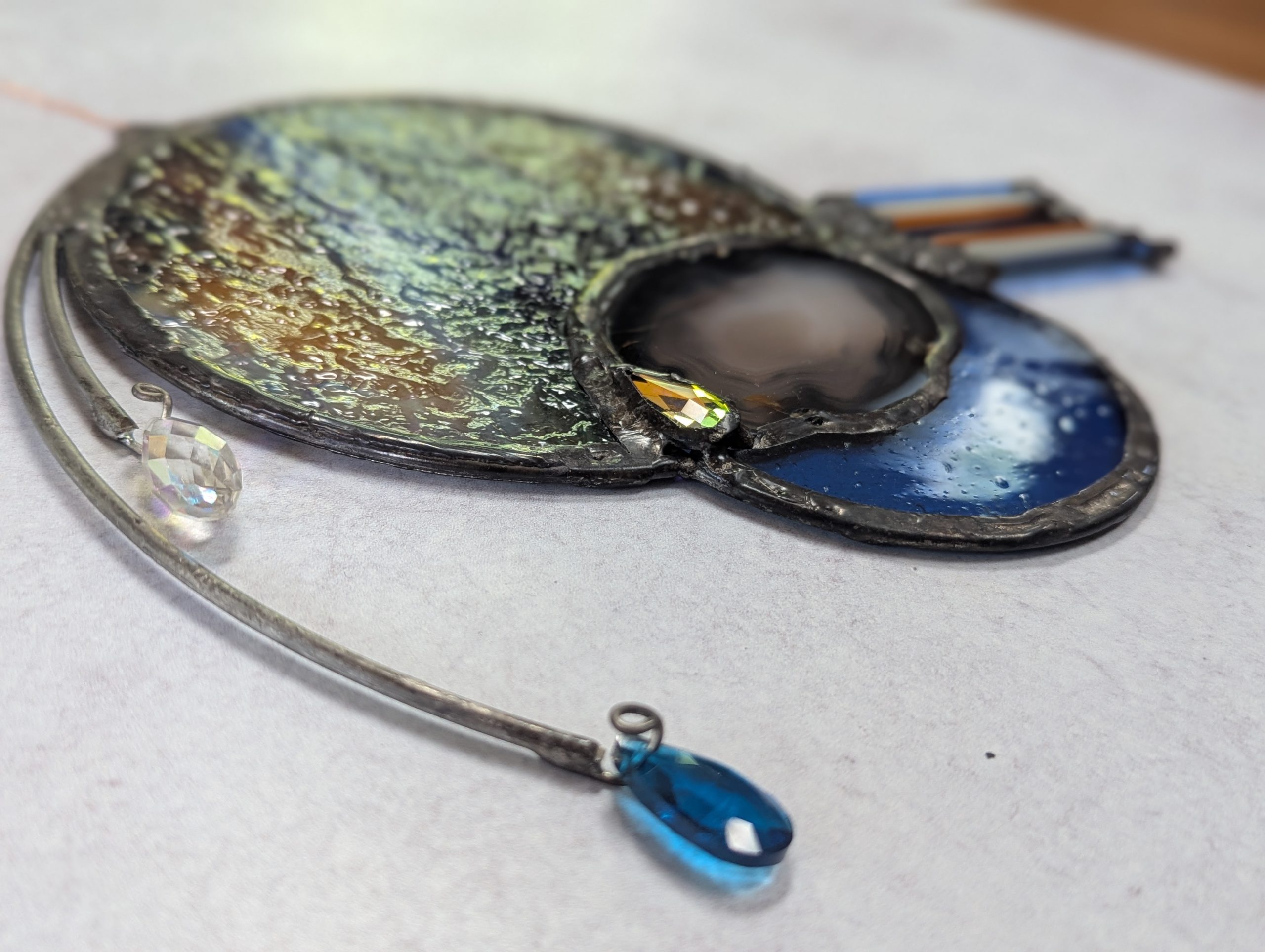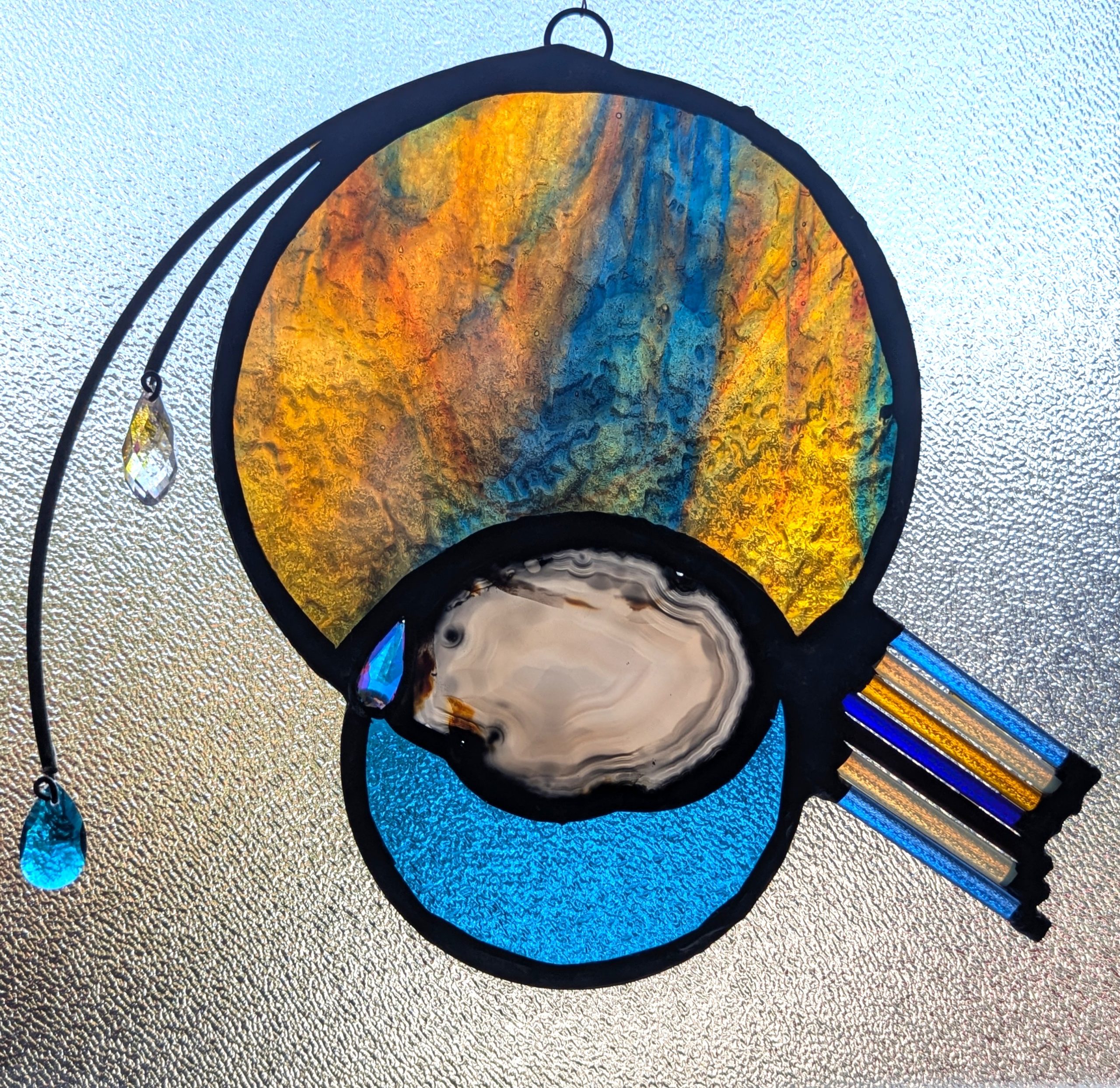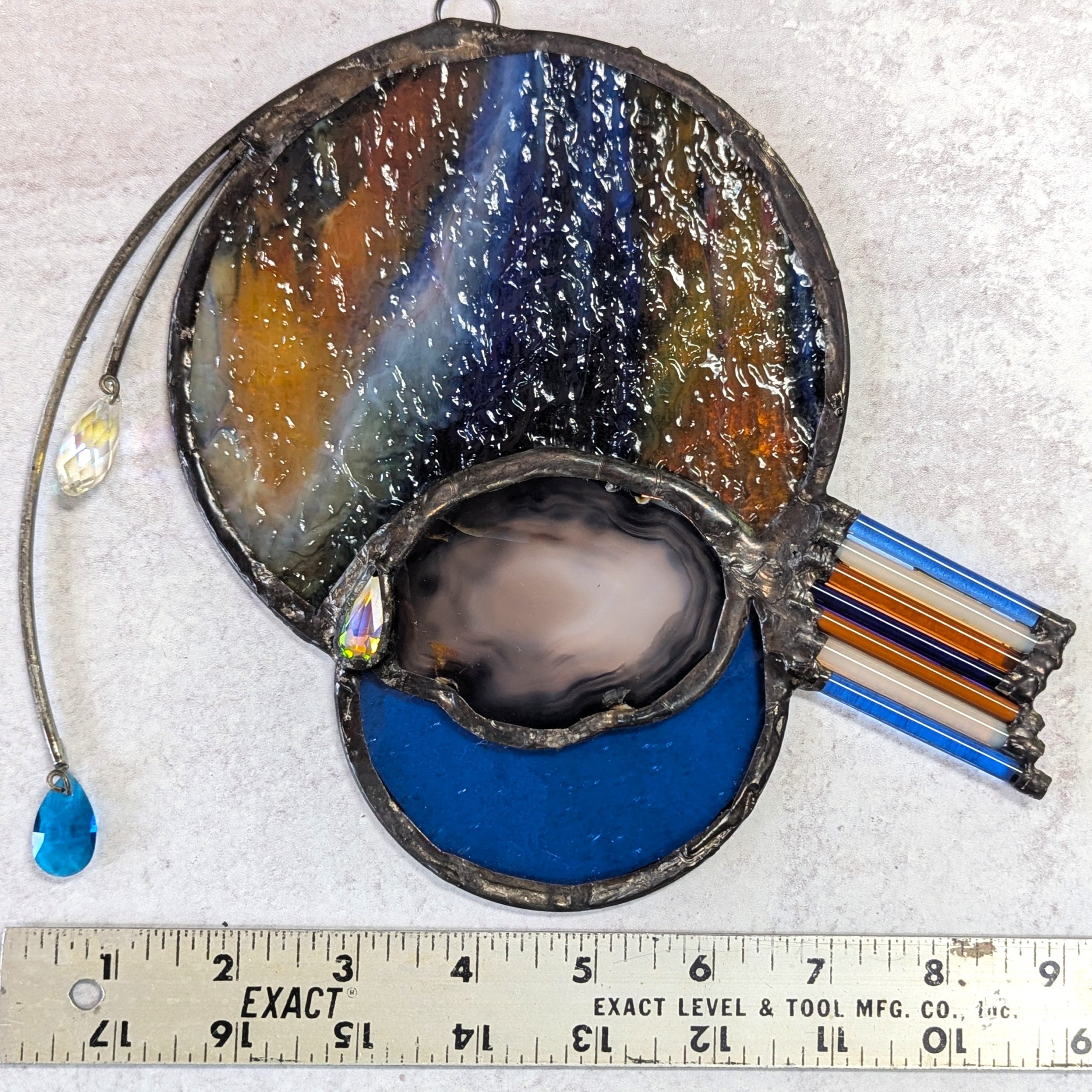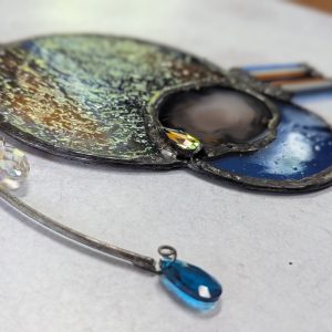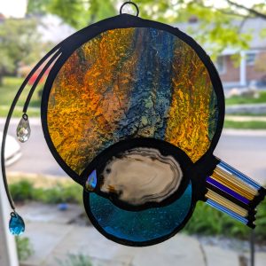 This stained glass panel was made with a variety of materials and techniques. It is approximately 9″ wide and 8″ long, much larger than your usual suncatcher. I used a variety of stained glass, a geode slice, rods and crystals. Very unique style and detailing, this would be a great gift for anyone with contemporary and abstract tastes. Superbly well crafted, it will be a cherished gift for yourself or a loved one. Please do not use a suction cup – this piece needs to hang from something strong (I have included a hanging wire).