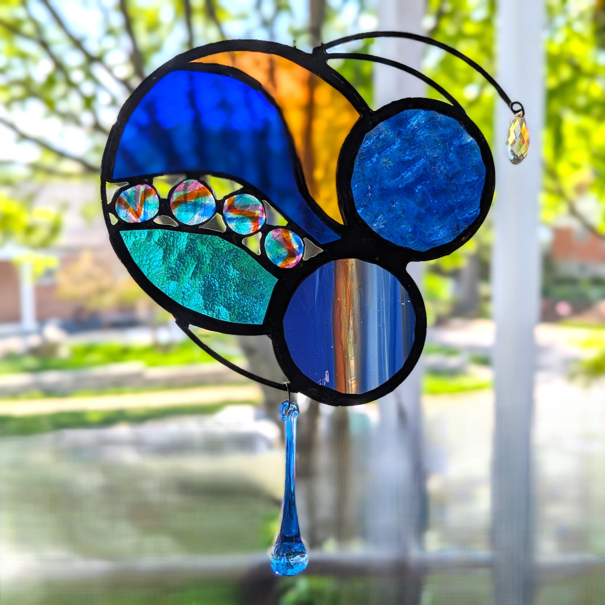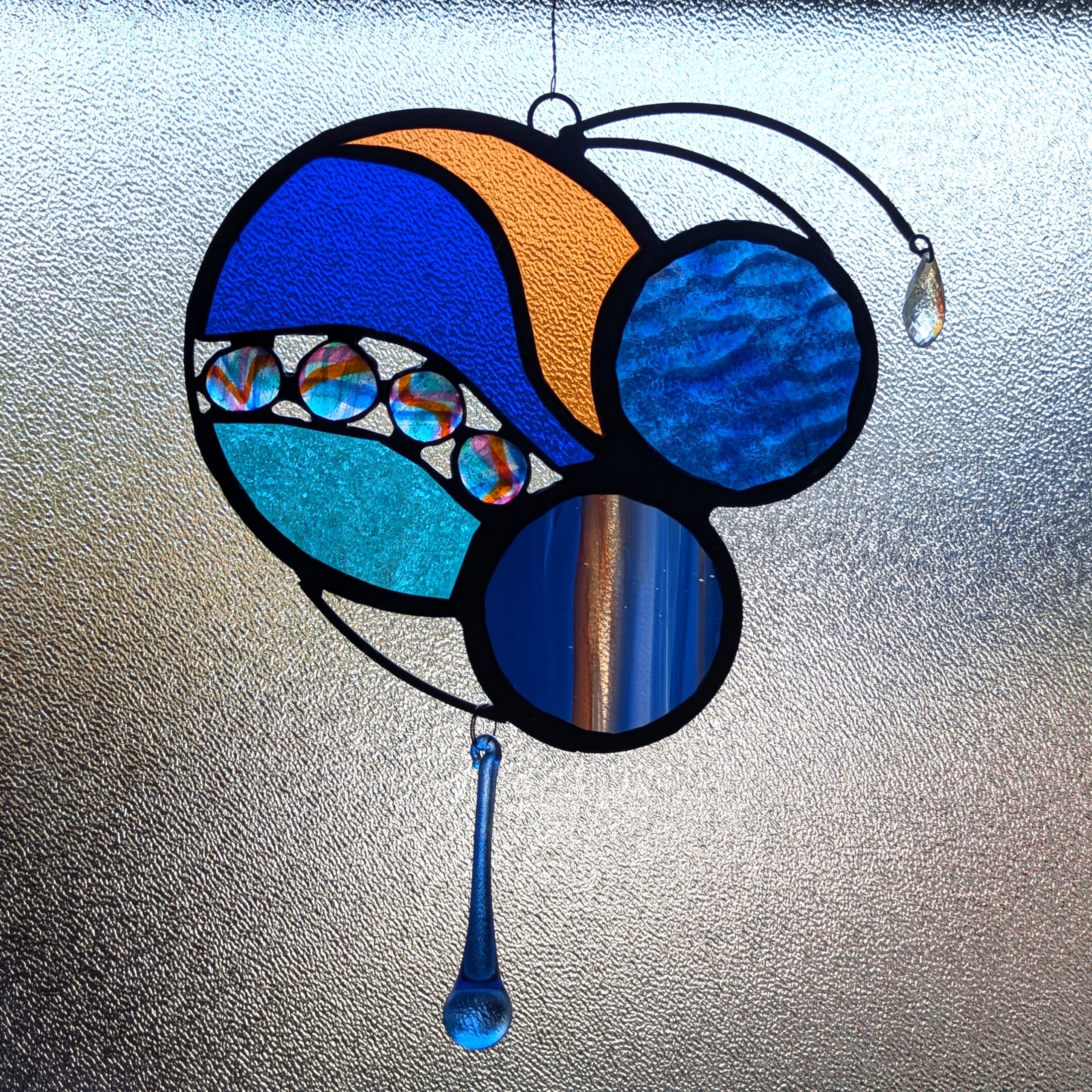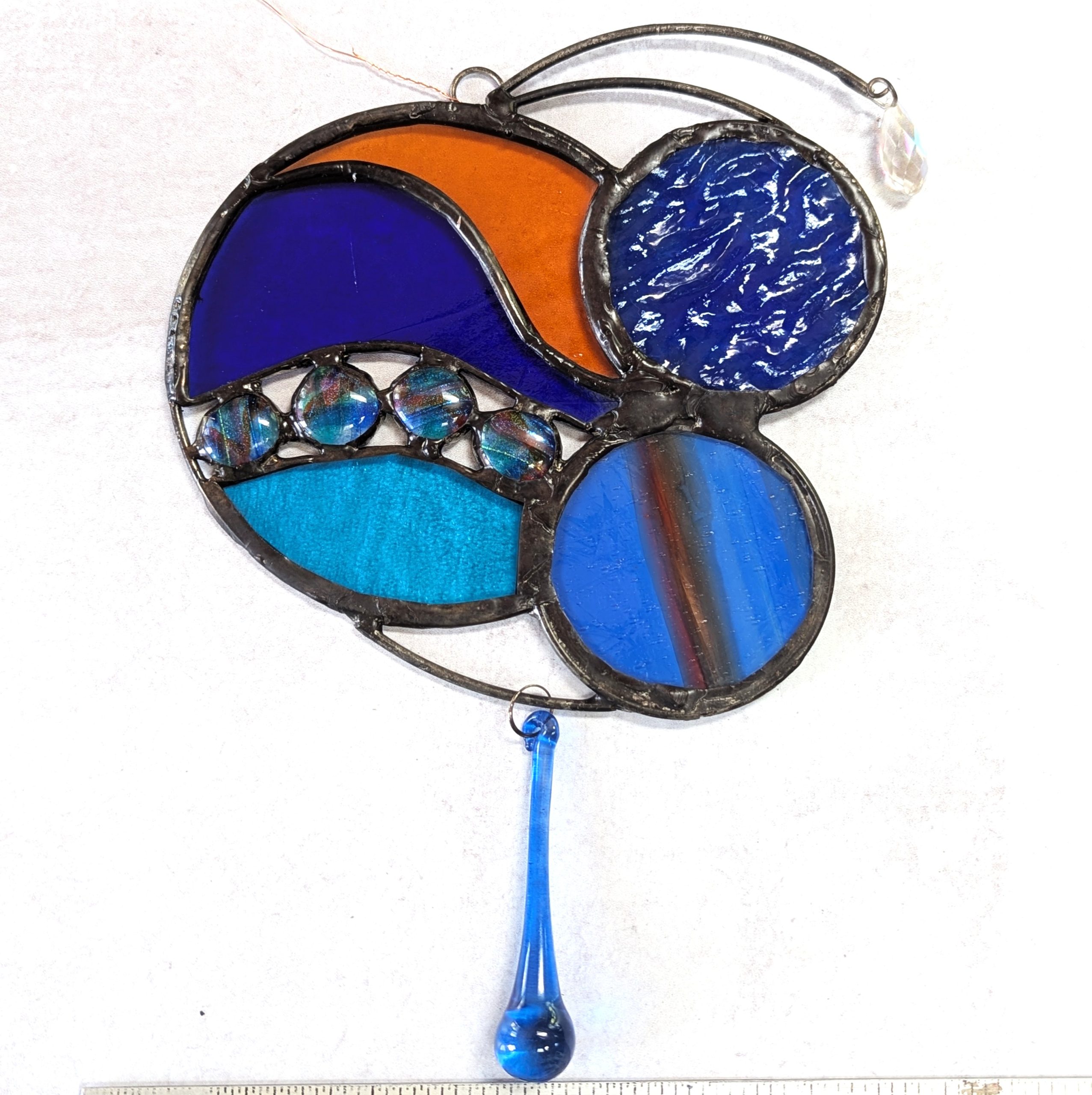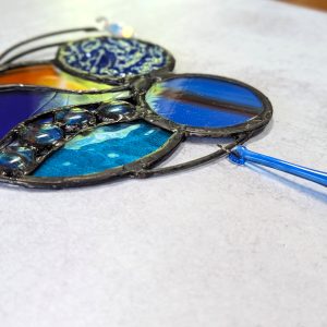 This stained glass panel was made with a variety of materials and techniques. It is approximately 7″ wide and 9″ long, much larger than your usual suncatcher. I used a variety of stained glass, fused glass and crystals. Very unique style and detailing, this would be a great gift for anyone with contemporary and abstract tastes. Superbly well crafted, it will be a cherished gift for yourself or a loved one. Please do not use a suction cup – this piece needs to hang from something strong (I have included a hanging wire).